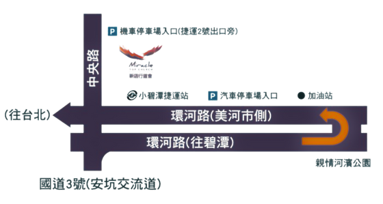 下安坑交流道,往新店/碧潭方向靠右至環河路。
